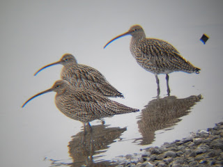 14 CURLEW were outside the hide again before flying off north, onto the fields to feed, 18 COMMON SNIPE were dotetd around the islands, and banks: