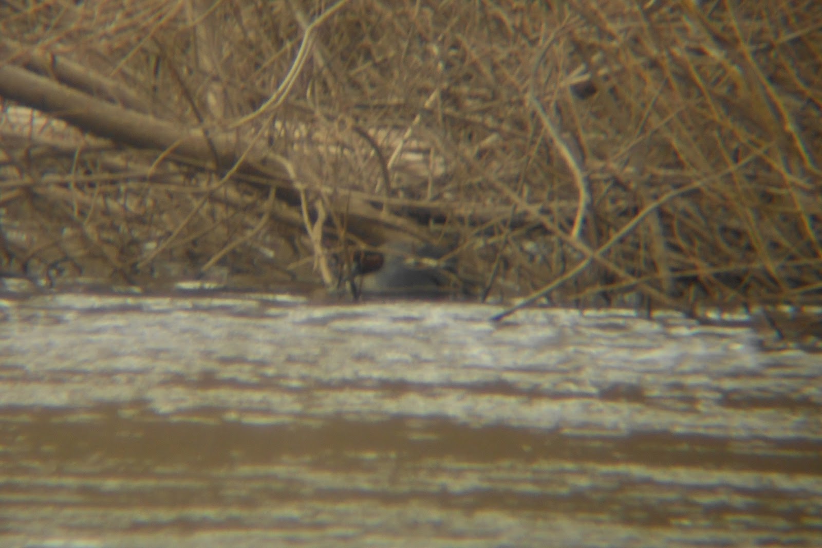 I had only been on patch for about 5 minutes before I reached the river, and scanned downriver, and was amazed to see a pair a TEAL! I got my scope out and onto them (they were fairly far downstream), and in doing this I found myself looking at 4 TEAL, and then 6 TEAL!